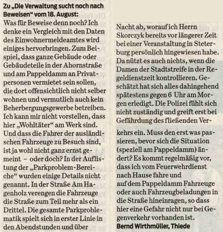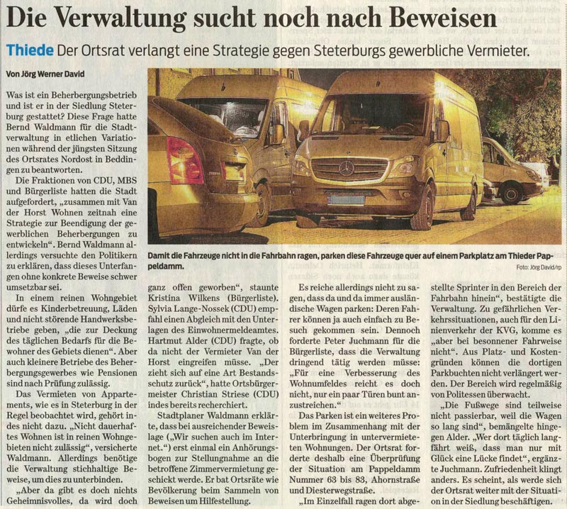 Bei der Überschrift in der heutigen Salzgitter-Zeitung kommt man als Thieder/Steterburger ernsthaft ins Stocken. Beweise werden noch gesucht??? Seit Jahren werden Wohnungen an z.B. Handwerker und Monteure untervermietet und damit wird sich eine goldene Nase verdient. Entsprechende Internet-Seiten der ortsansässigen Anbieter werben mit Vermietung (übrigens sogar auch auf der Webseite der Stadt Salzgitter!). Was gibt es da noch zu beweisen?